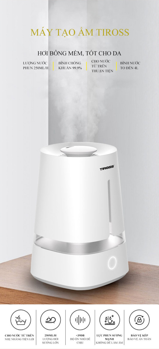 – Máy sử dụng điều khiển cảm ứng cùng với 3 cường độ khuyếch tán độ ẩm có thể được điều chỉnh, máy có thể đáp ứng độ ẩm cho không gian rộng từ 25- 30m². Với chức năng tự động ngắt khi hết nước đảm bảo độ an toàn khi sử dụng và đảm bảo độ bền lâu cho máy.